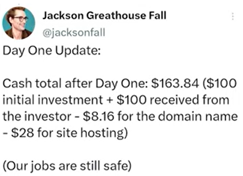 돈을 벌기는 했지만, 많은 액수를 벌진 못한 결과였습니다. 그러나, 이게 끝이 아니었습니다. 이 챌린지를 시작한 시점에 잭슨 폴은 기존 3700명이었던 SNS팔로워가 현재 10만 명에 이르게 되었고, 이후 투자자들이 등장해. 그 후로 부터 사용비용을 제외하고 보유 현금이 7700달러 (약 1,000만원) 정도라고 공개했습니다.